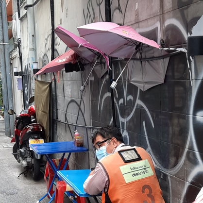 It was starting to drizzle as I passed this scene. Ingenuity mixed with hospitality; it is an honest effort by the simple hawker. I wondered what it would shelter. It was too small and flimsy to shelter man from the scorching lunch time sun or a heavy drizzle, or from strong winds or the thick dust from the Bangkok traffic. Perhaps it is just to shelter the bowl of noodles from something that may drop in from above.