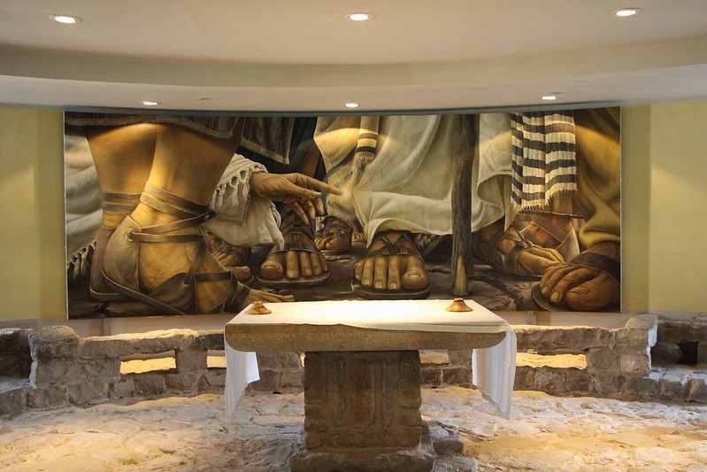 ‘*The Encounter Chapel, is dedicated to Jesus’ encounter with all of us, as illustrated by the large painting, titled “Encounter”, in the back of the chapel. The floor is that of the original first century marketplace of the Magdala port’. (Magdala, Holy Land)